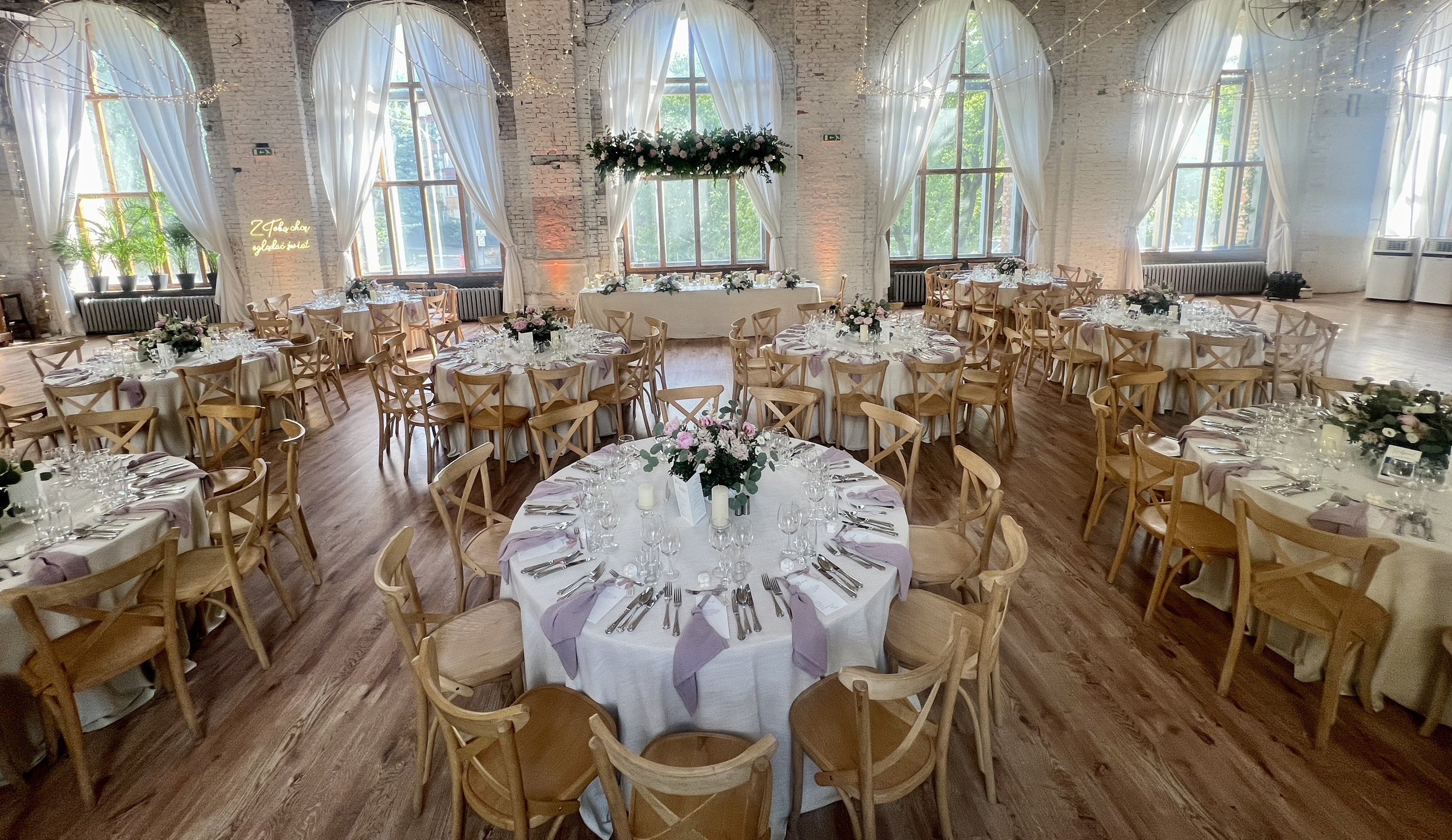 Wnętrze obiektu łączy zabytkową architekturę z surowym pięknem przestrzeni. Ceglane ściany, monumentalne łukowe okna oraz siedmiometrowa wysokość nadają wnętrzu industrialny, a zarazem elegancki klimat – stanowiąc idealne tło dla wyjątkowych wydarzeń i nowoczesnych aranżacji.